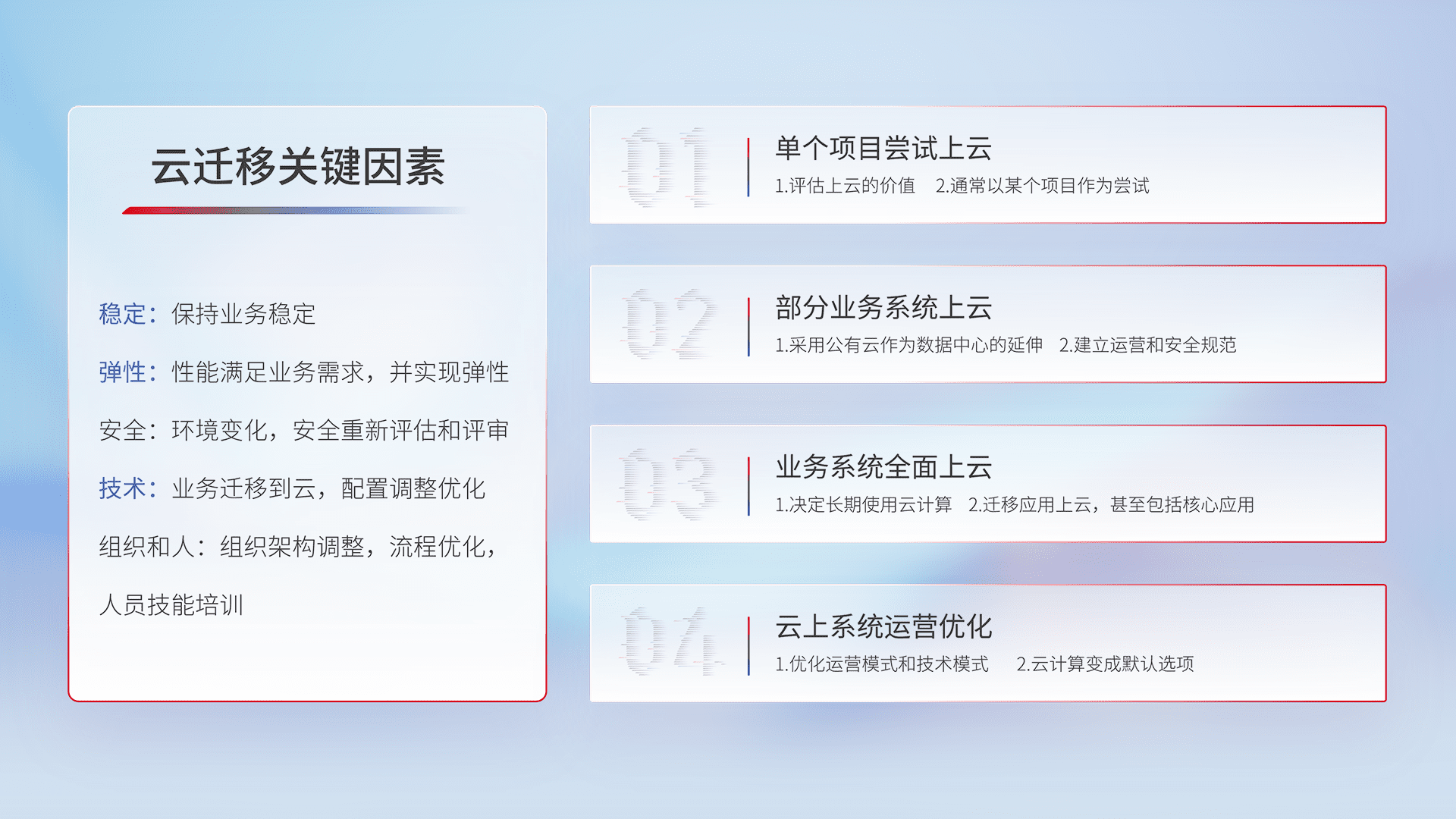 结合实际业务,,,,从规划设计、、、、云平台选型、、、云原生改造、、、、数据迁移、、集成交付,,迁移全过程为客户识别最佳上云路径,,做好风险识别管理,,,,设计网络架构、、、、身份权限、、、、安全审计合规、、、操作审计、、、、日志审计、、、、监控告警策略、、、多站点容灾设计等,,,对云上基础设施进行整体规划,,,,提升IT治理水平,,,以满足弹性、、高可用、、高性能的需求。。。。