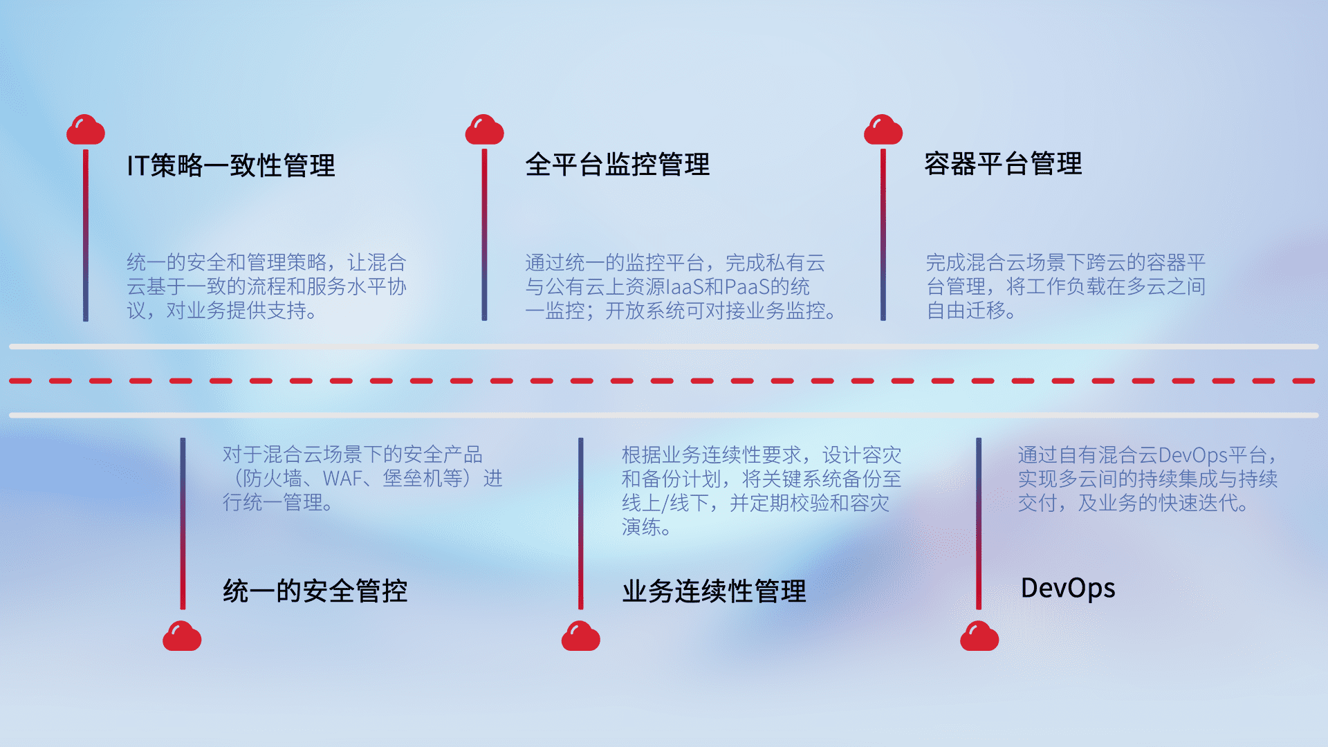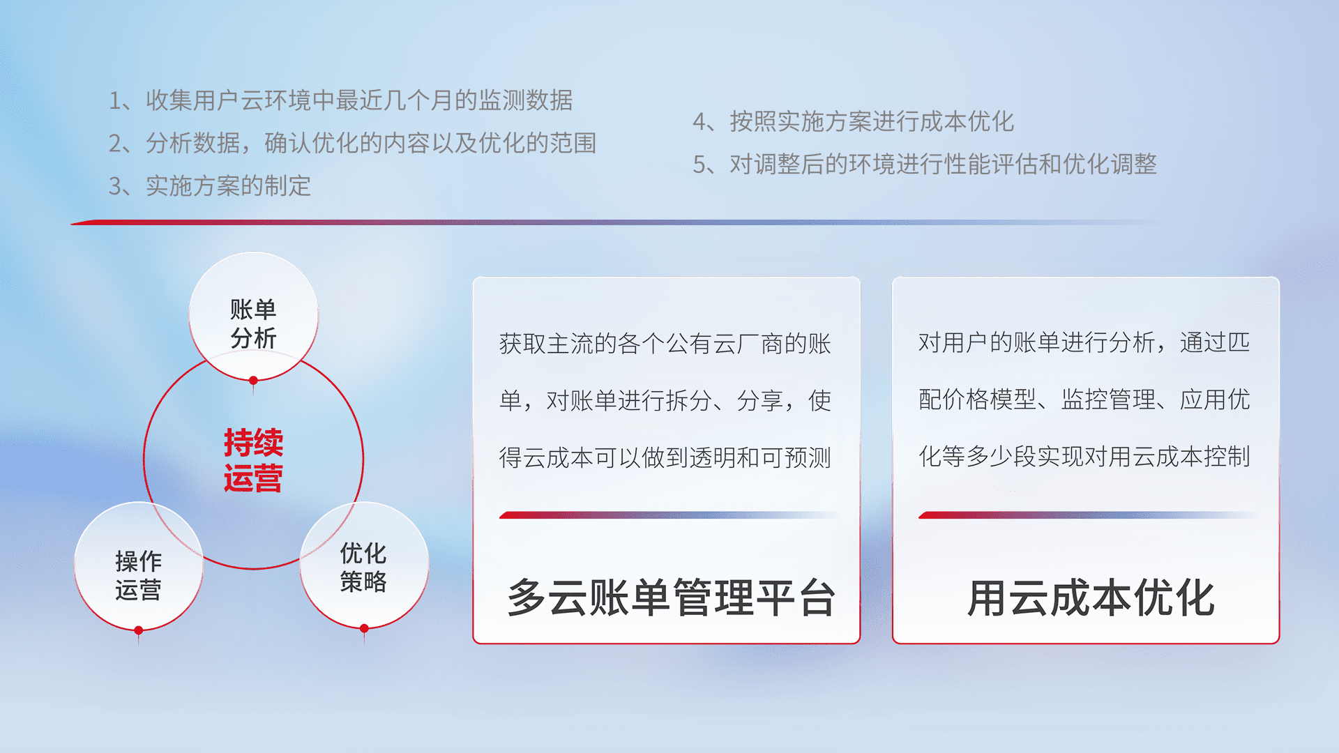 通过多云纳管,,以统一的资源数据模型把客户的云资源进行抽象和封装,,,,进而实现对多云资源的统一操作,,,保障云资源管理的可靠性、、稳定性与可用性。。量身定制化运维内容,,配置、、、开发运维、、补丁管理、、备份、、、、监控、、认证和访问管理、、、、审计和日常巡检等,,,,保障在用云过程中的可靠度,,稳定度以及高可用率。。