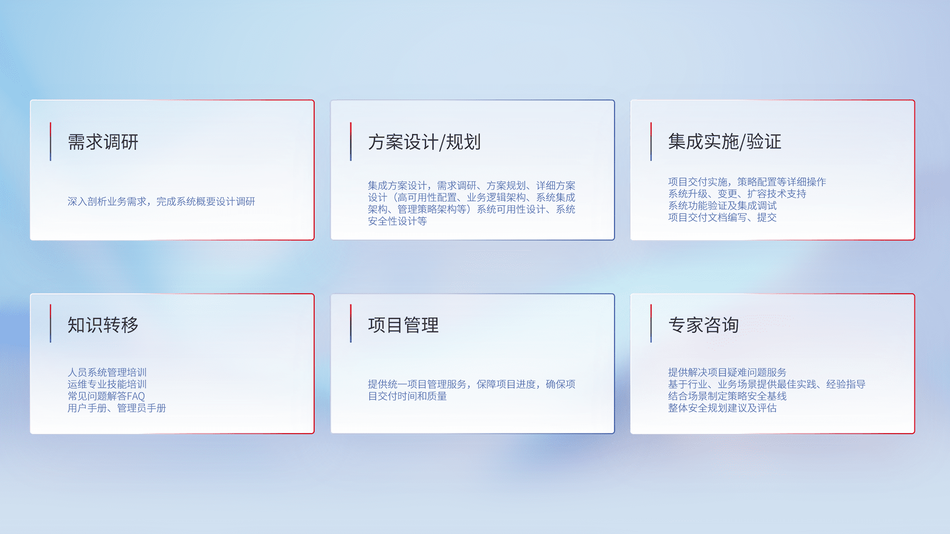 针对客户行业特性,,,,将宏观的安全战略和需求,,,通过专业的交付服务,,实现项目落地,,,,为客户提供标准规范的集成交付服务。。。。